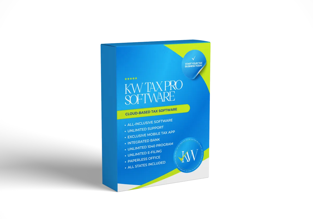 KW Tax Pros provides professional IRS-compliant software with e-filing capability, bank product integration, and client management tools included.